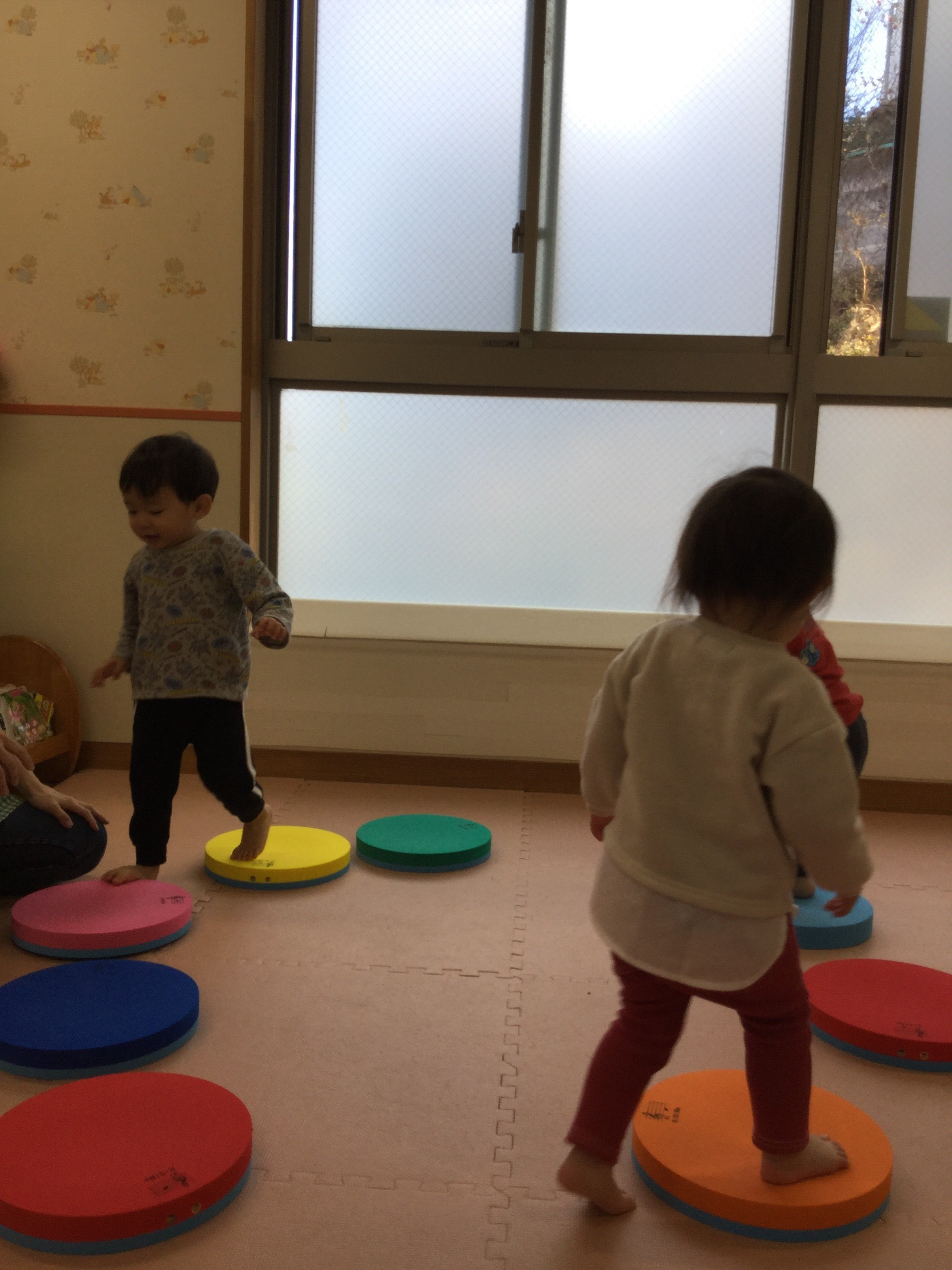 丸いパットの上を歩くだけで音が鳴るよ。おっかなびっくり乗っていた子どもたちも段々とノリノリになっていきました。サーキットの一部で、音のなるコースを作ったり、着地地点の音階を変化させて楽しみました。
