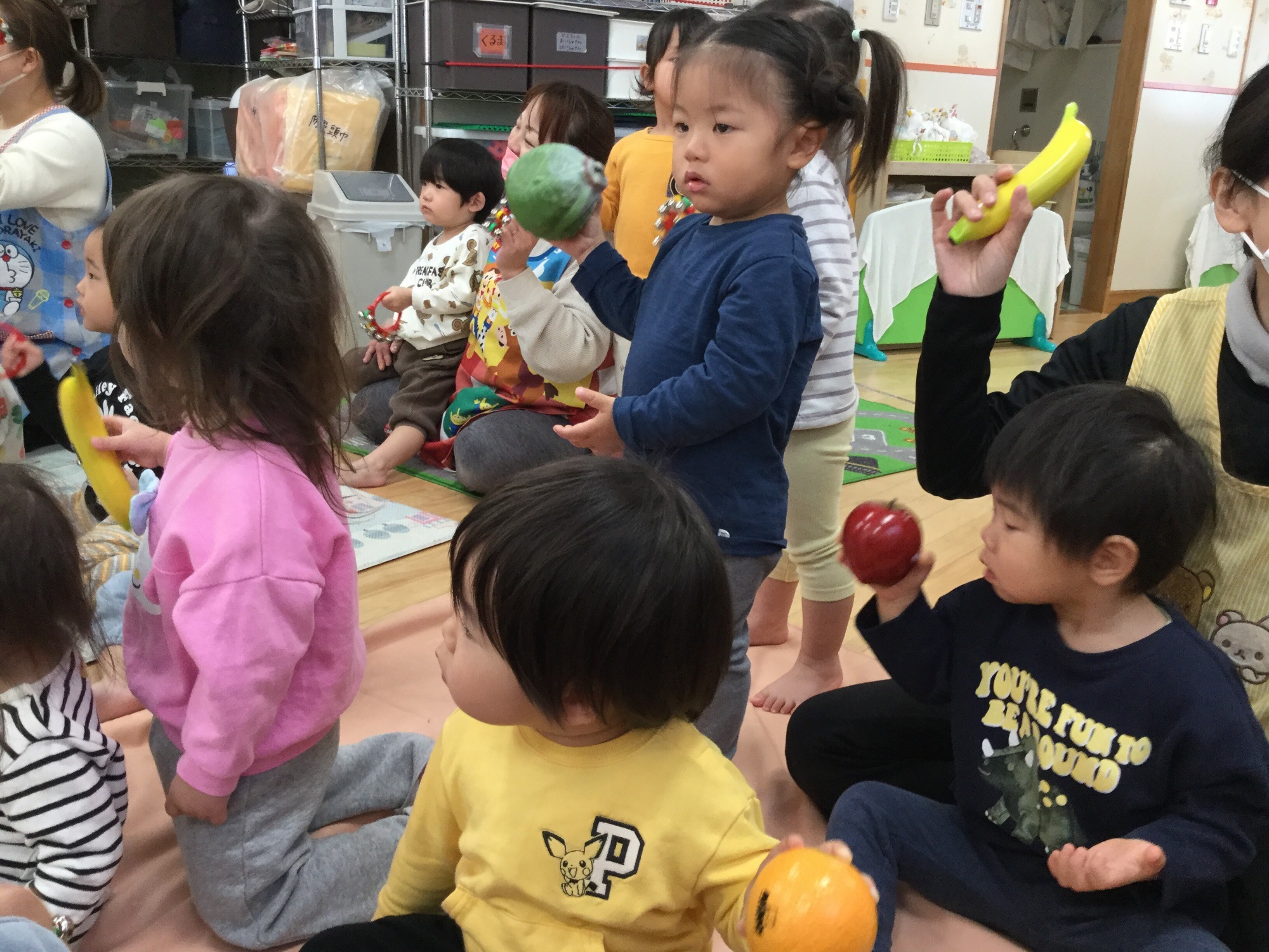 フルーツや木の実のマラカス、鈴を鳴らしてノリノリでダンシング♪♪