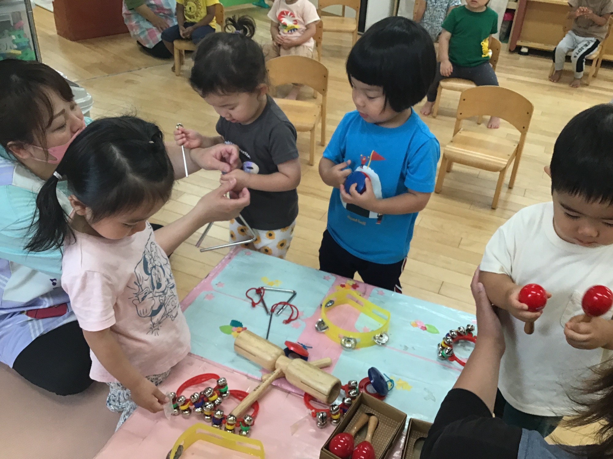 色々な楽器に触れて、それぞれ好みの楽器を見つけています。どれにしようかな~♪