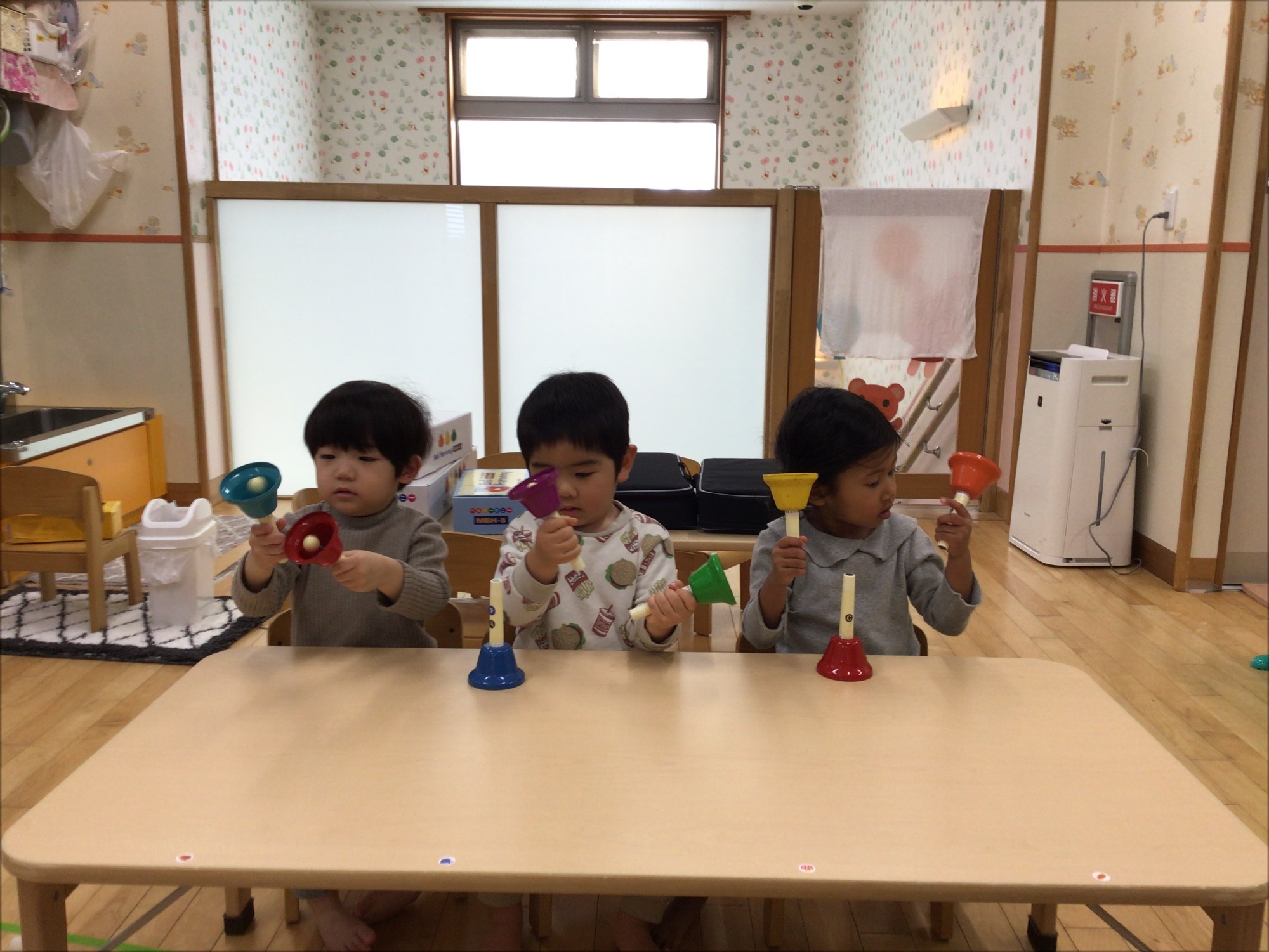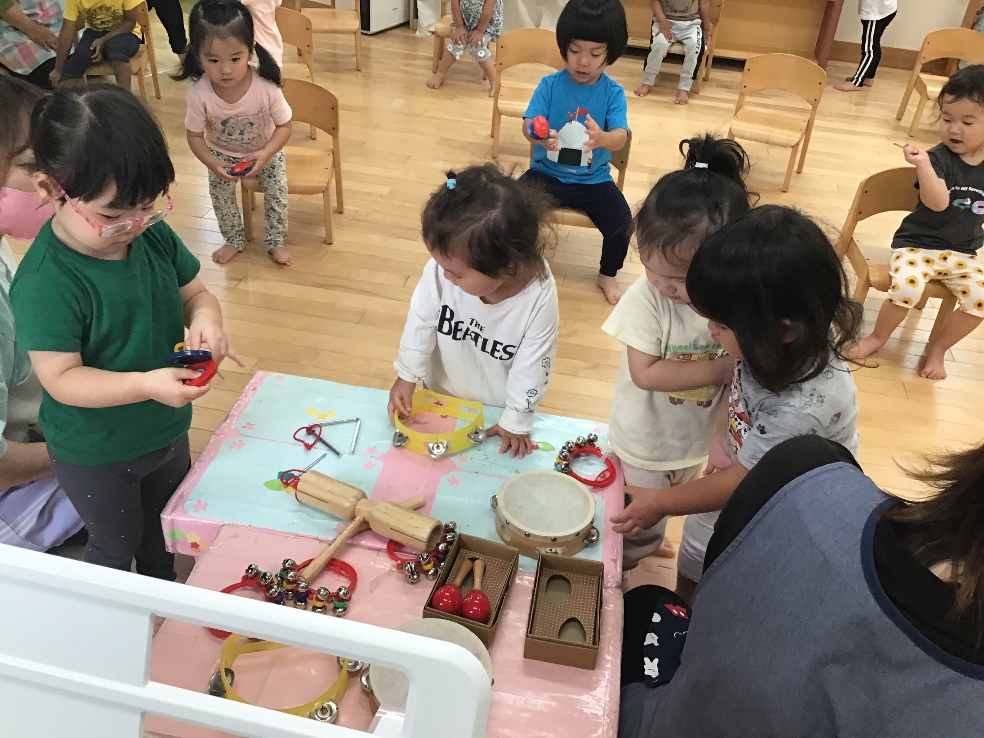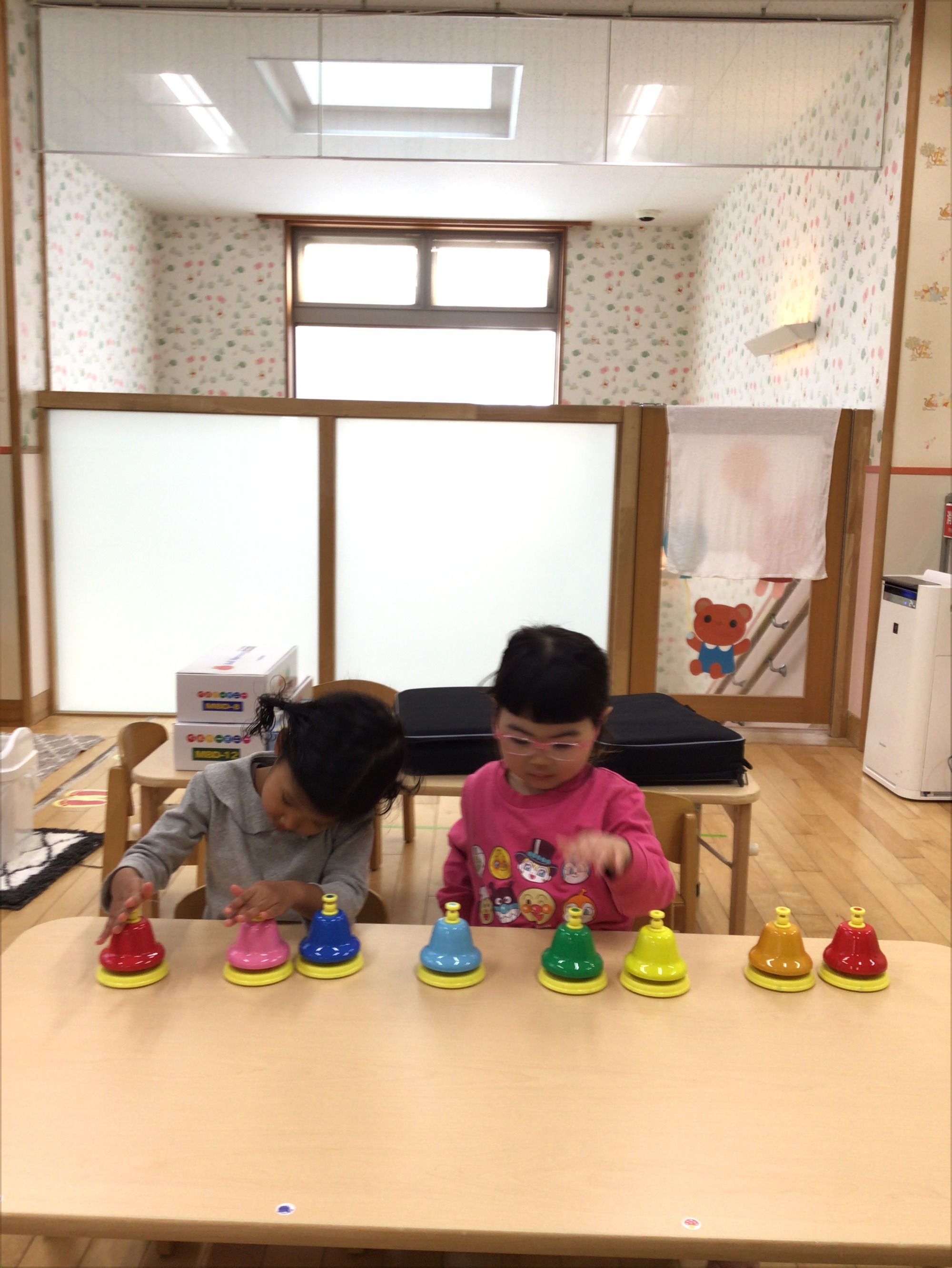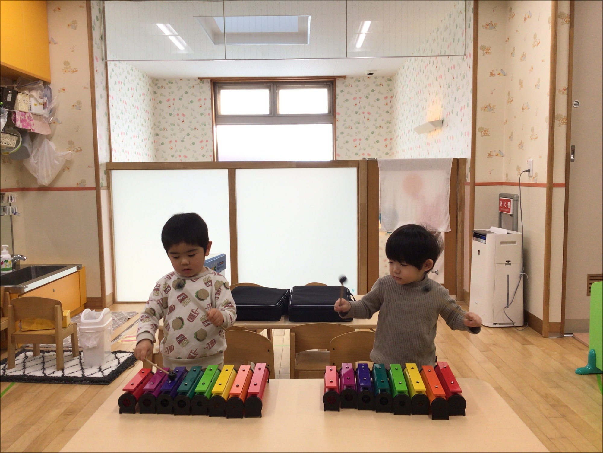 カラフルな鉄琴をバチで叩くと、きれいな音色♪♪バチを滑らせるなど色々な音の出し方も自然と行う子どもたちでした。2歳児は、子どもたちのリクエスト曲に合わせて、演奏会を開催していました。