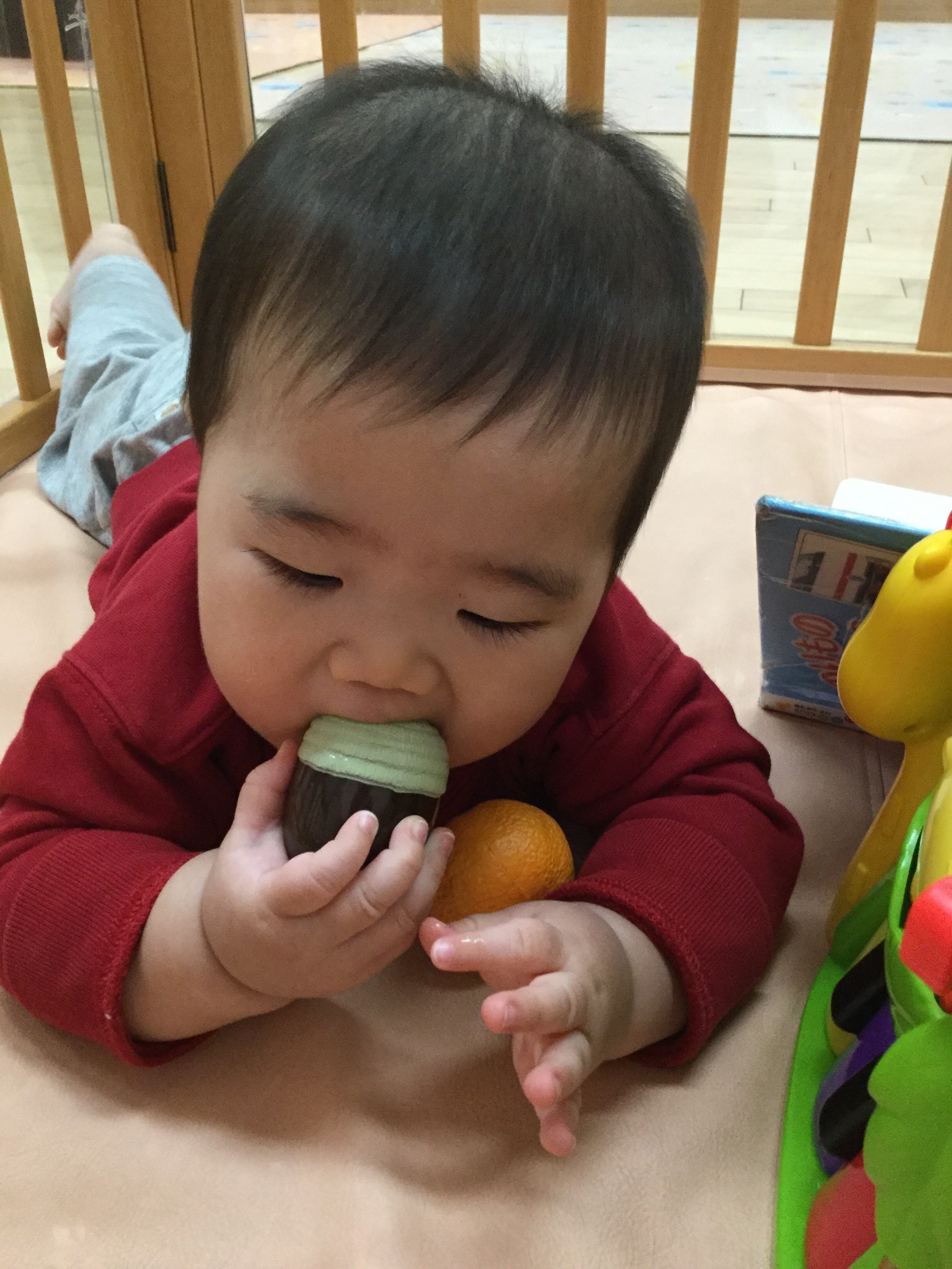 リトミックの先生が持って来てくれる「ベル」と同じで鳴らし方は、ばっちりOK!!優しく押したり、少し力を入れてみたり、覗き込んでどうやって音が鳴っているのかを見てみたり…(音ではなくて、構造に興味を持ってみたり…。それもまた、楽器に触れるいいきっかけでした。)