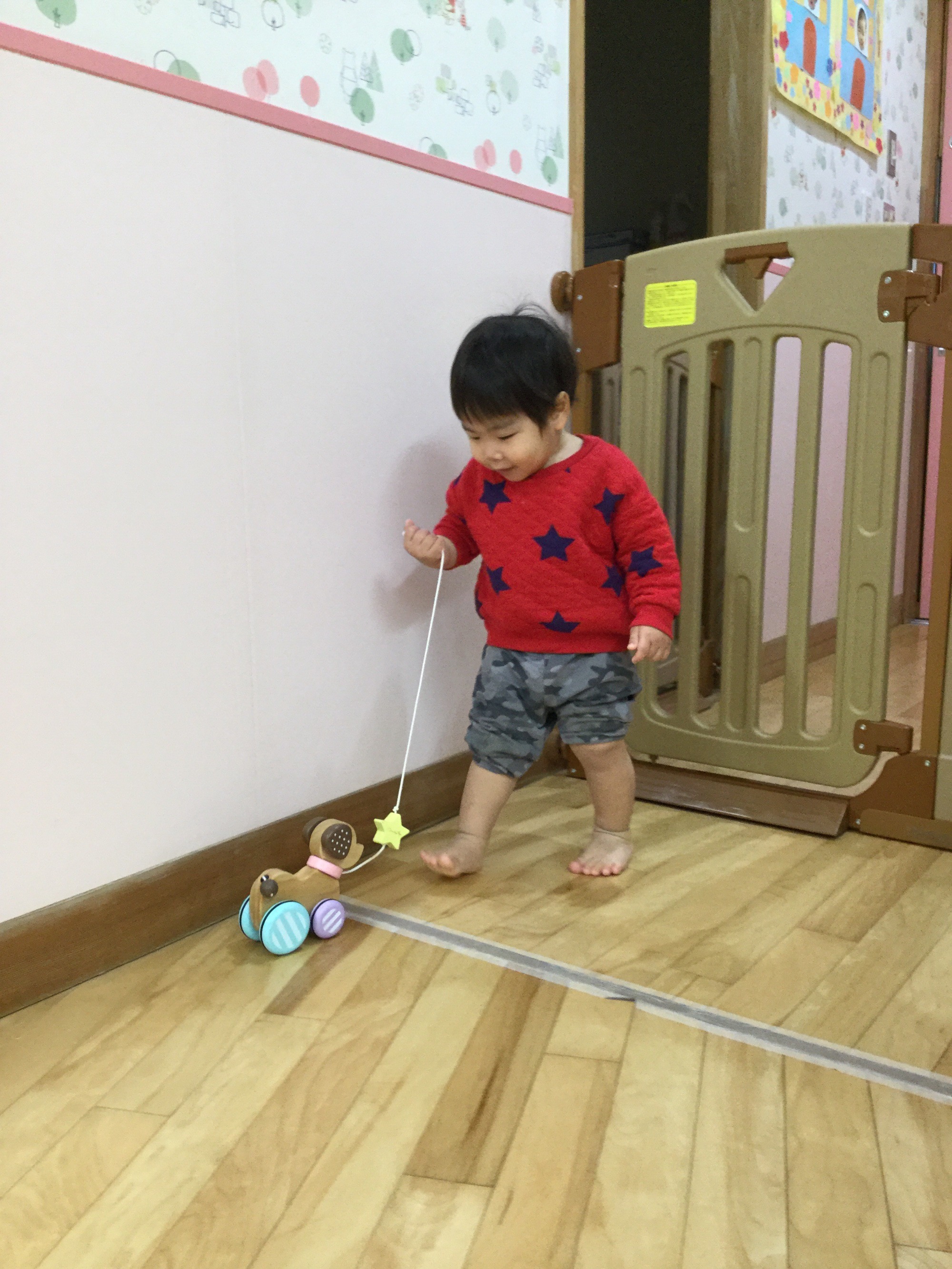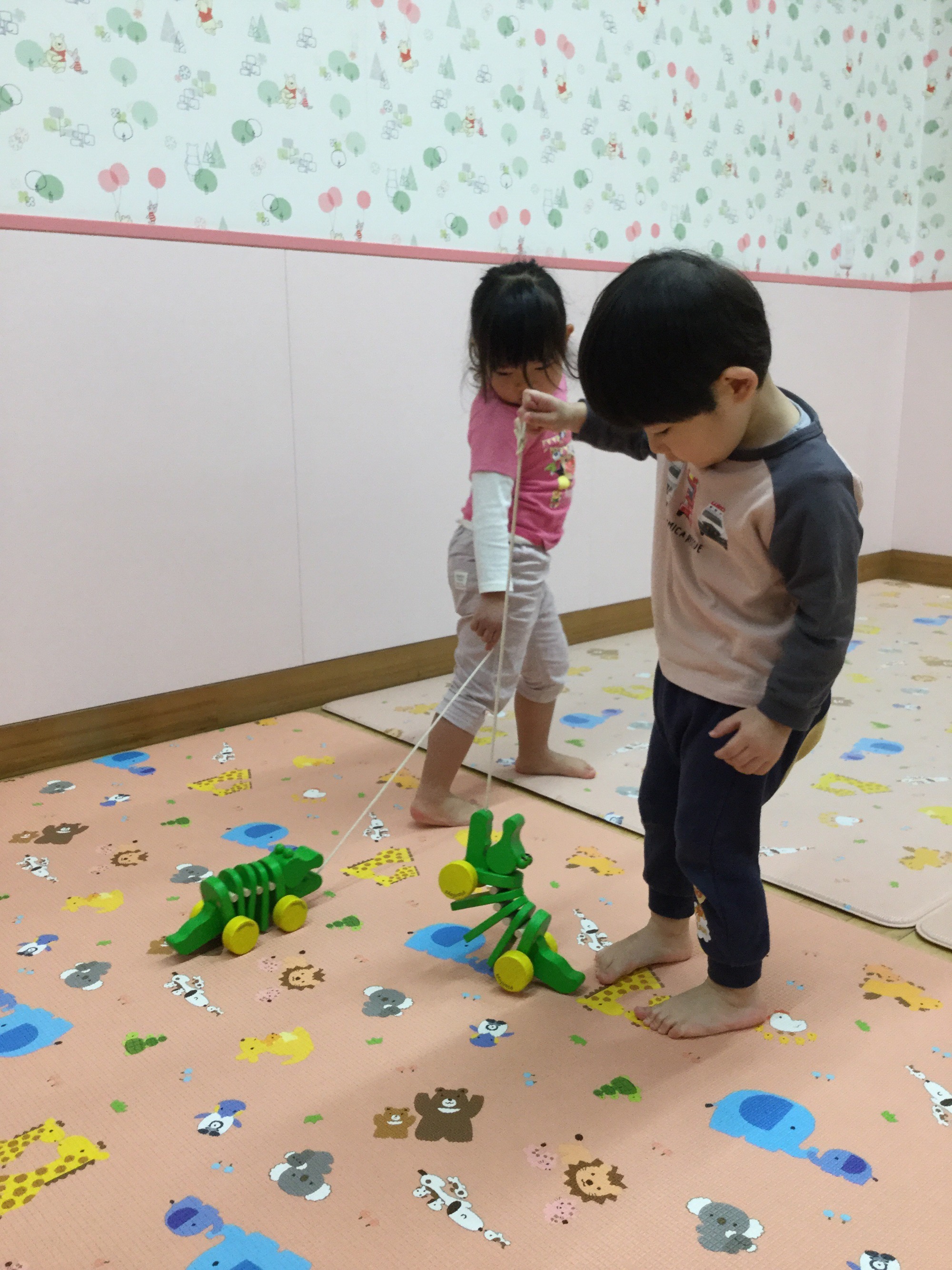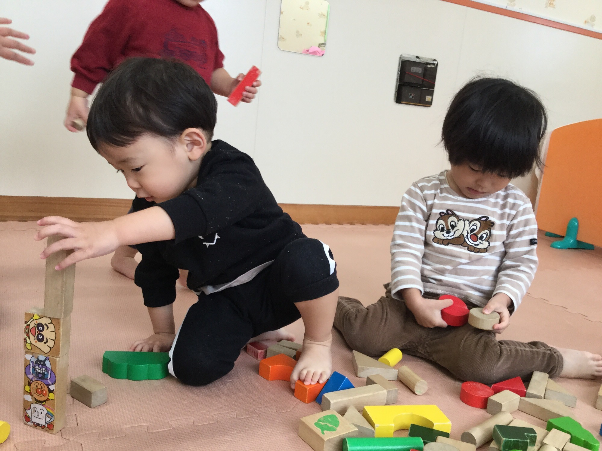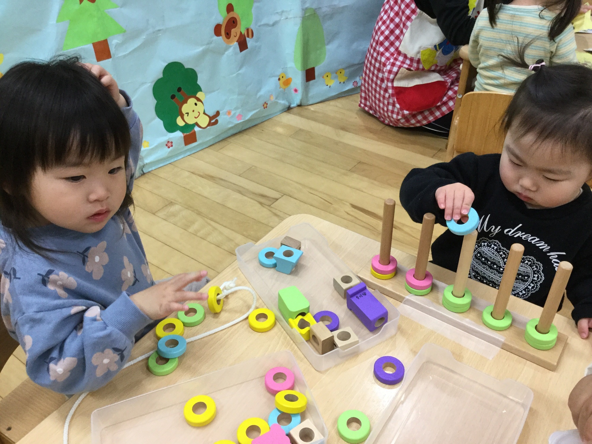 お部屋の中の「木」を探してみました。木は、色々な玩具に変身することが分かったかなあ…。理解するにはちょっと難しいけれど…楽しんで集中して遊んでいる姿に先生たちは「今日はこれでヨシッ!!」…と思うのでした。日々、先生たちの工夫は続きます。