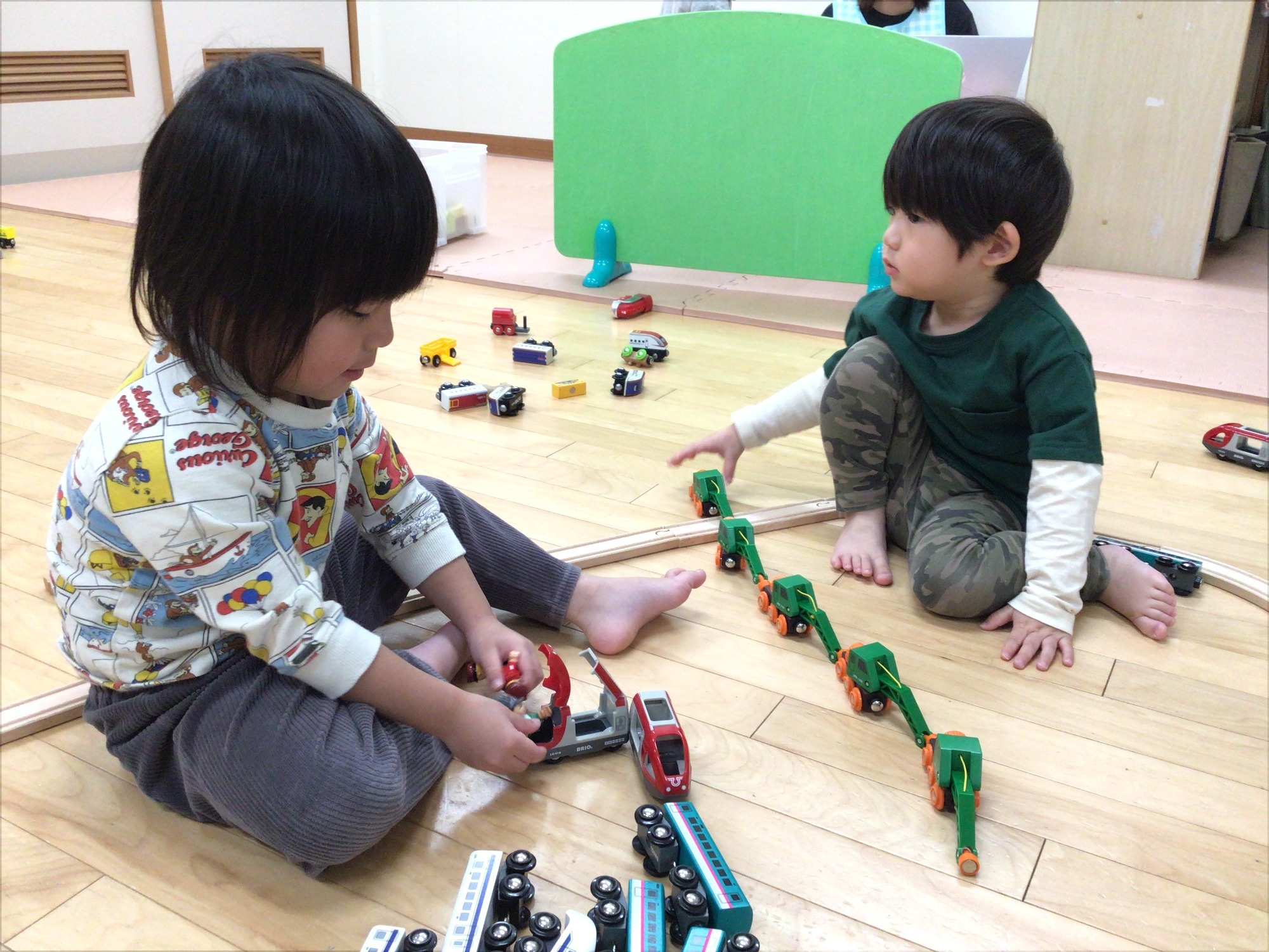 お気に入りの乗り物を繋げてじっくり遊びこんでいました。