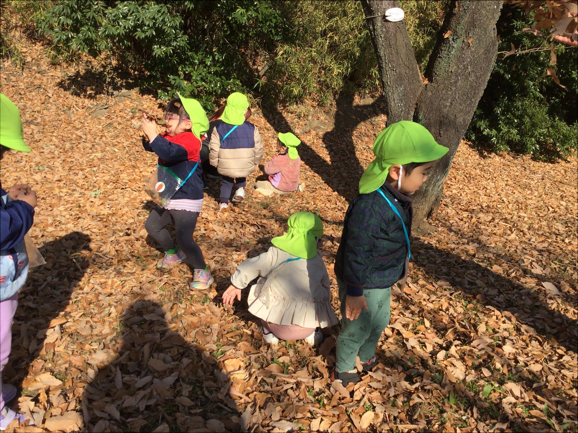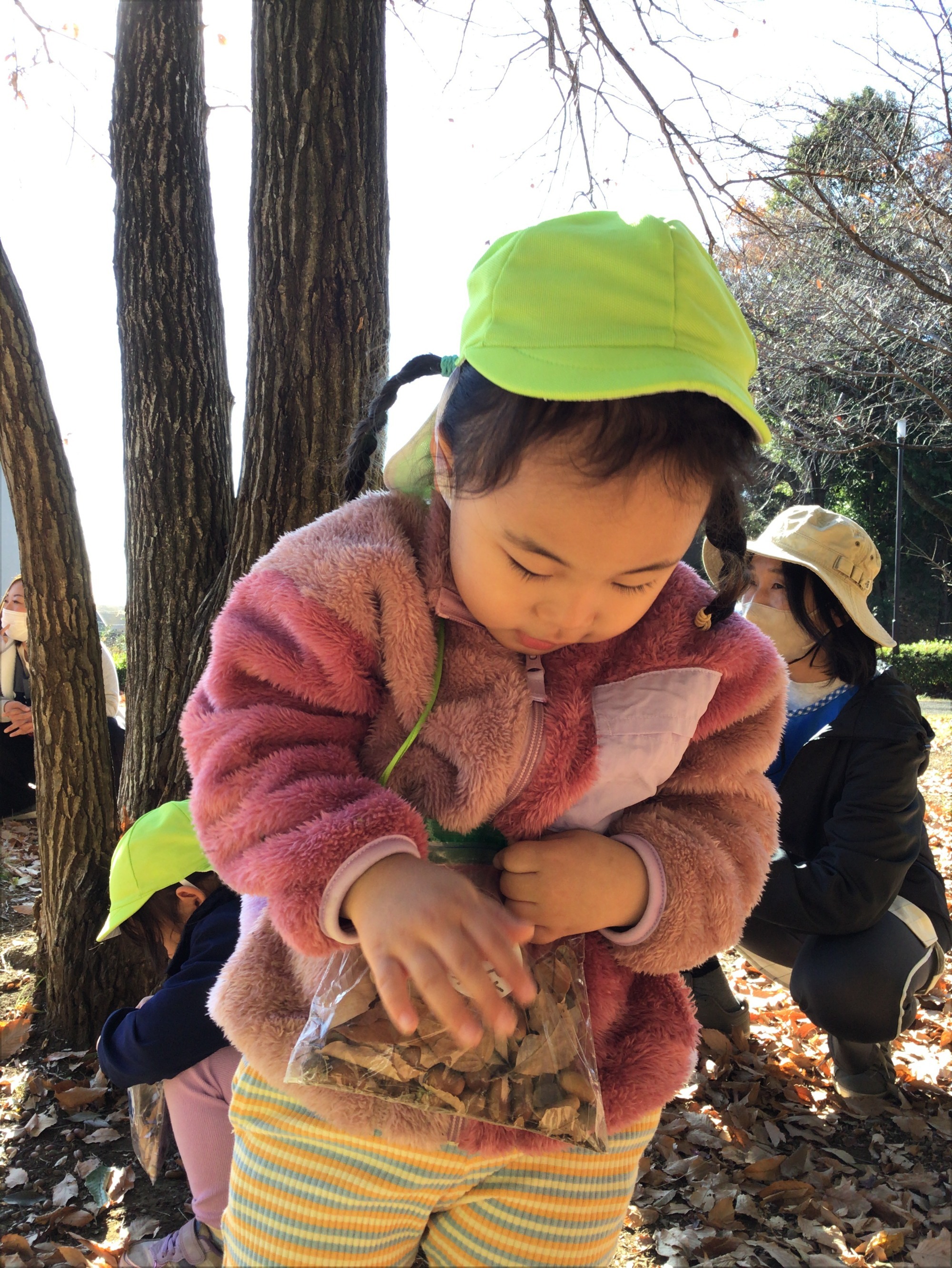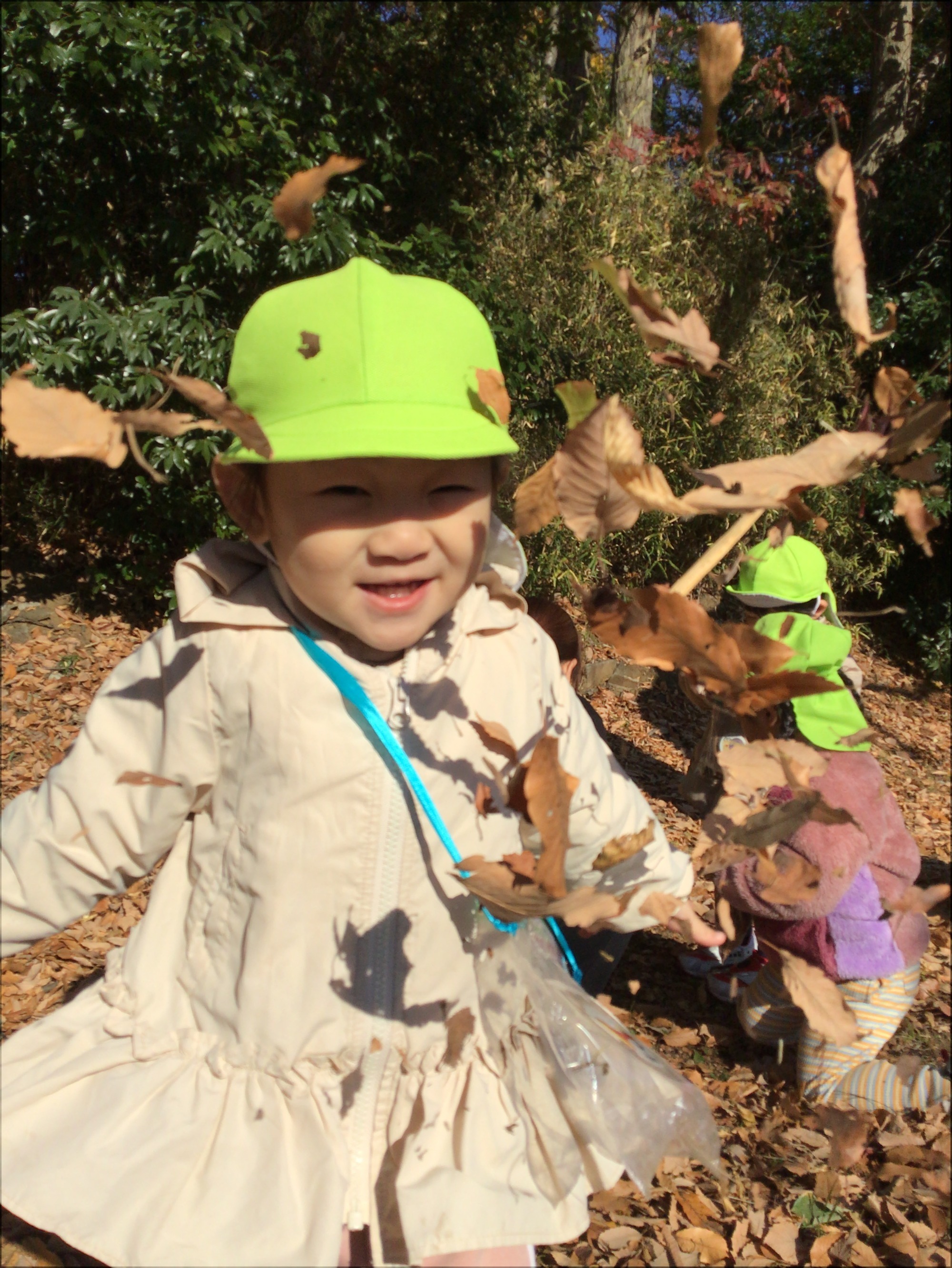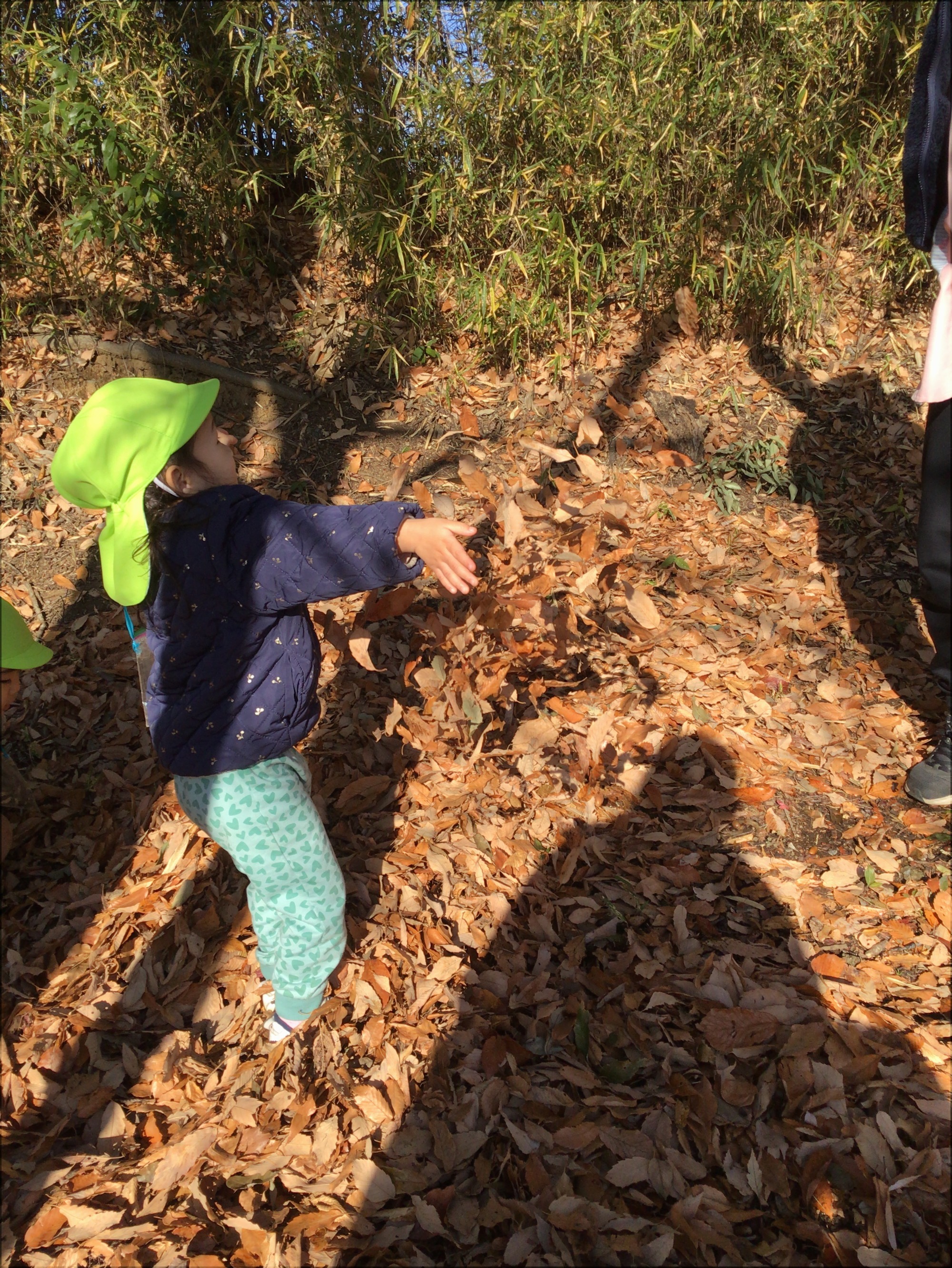 こんなにたくさんの落ち葉のじゅうたん。集めても集めても…なくなりません!!焼き芋ごっこや葉っぱの雨を降らせて大盛り上がりです。